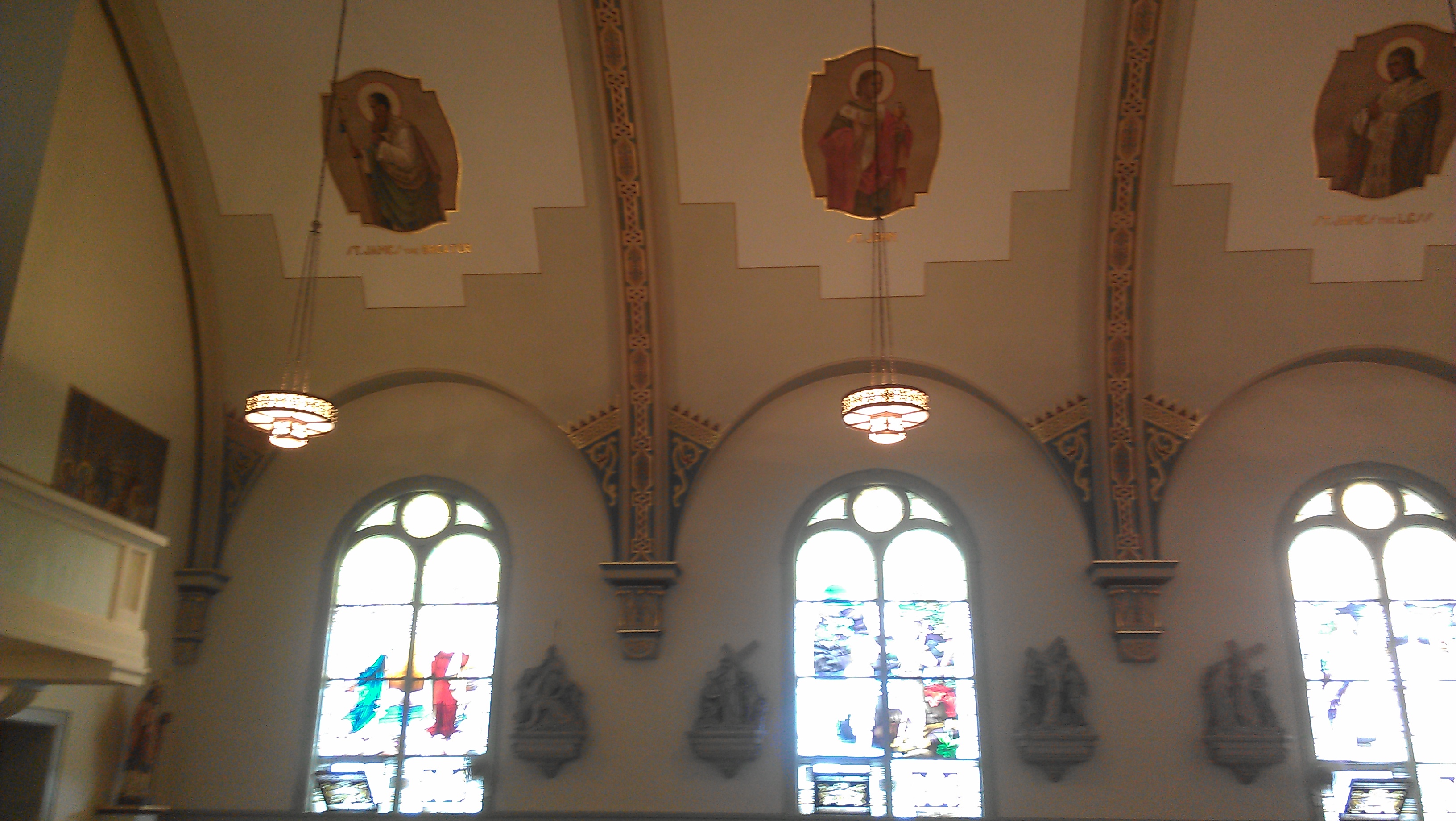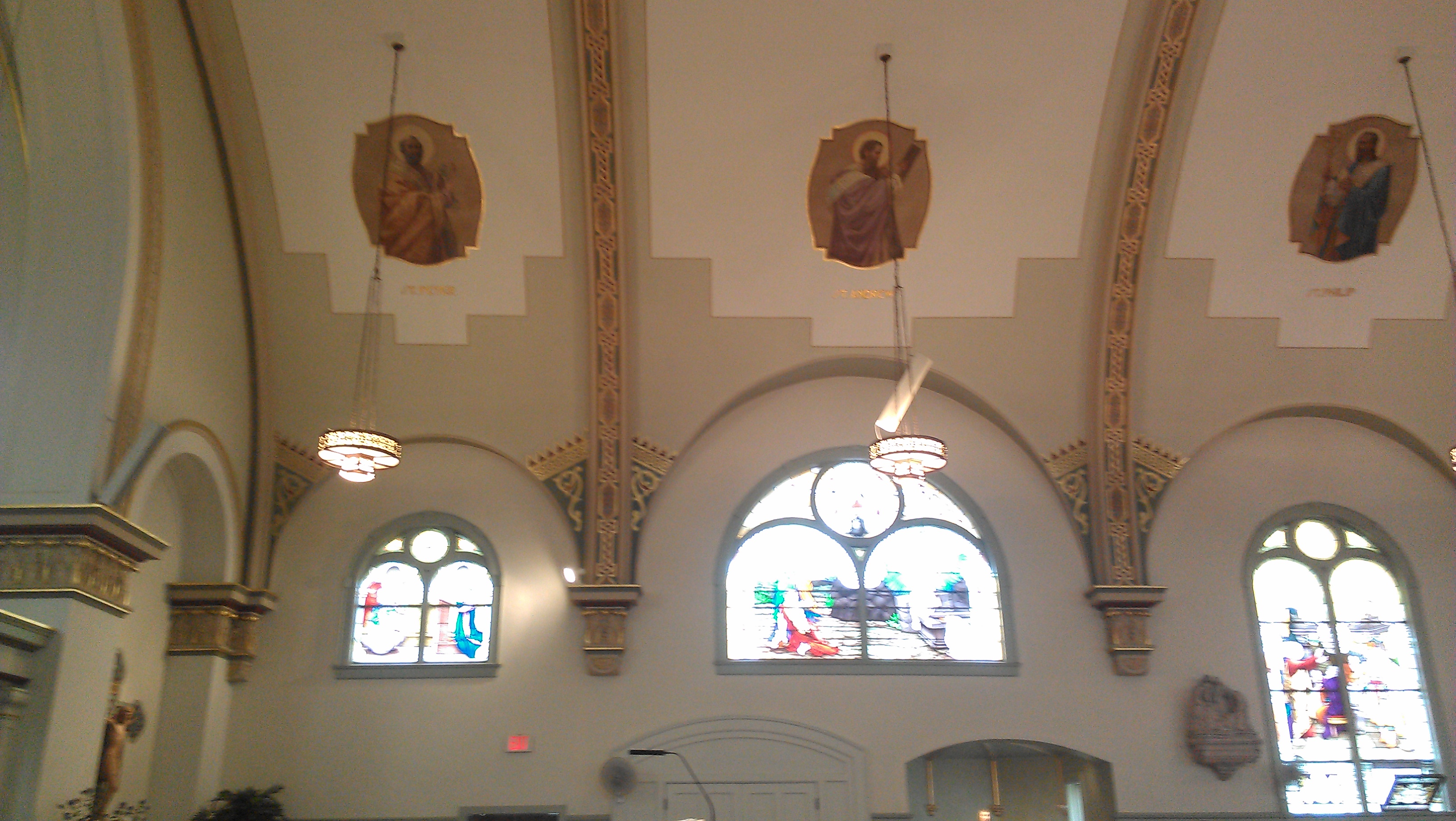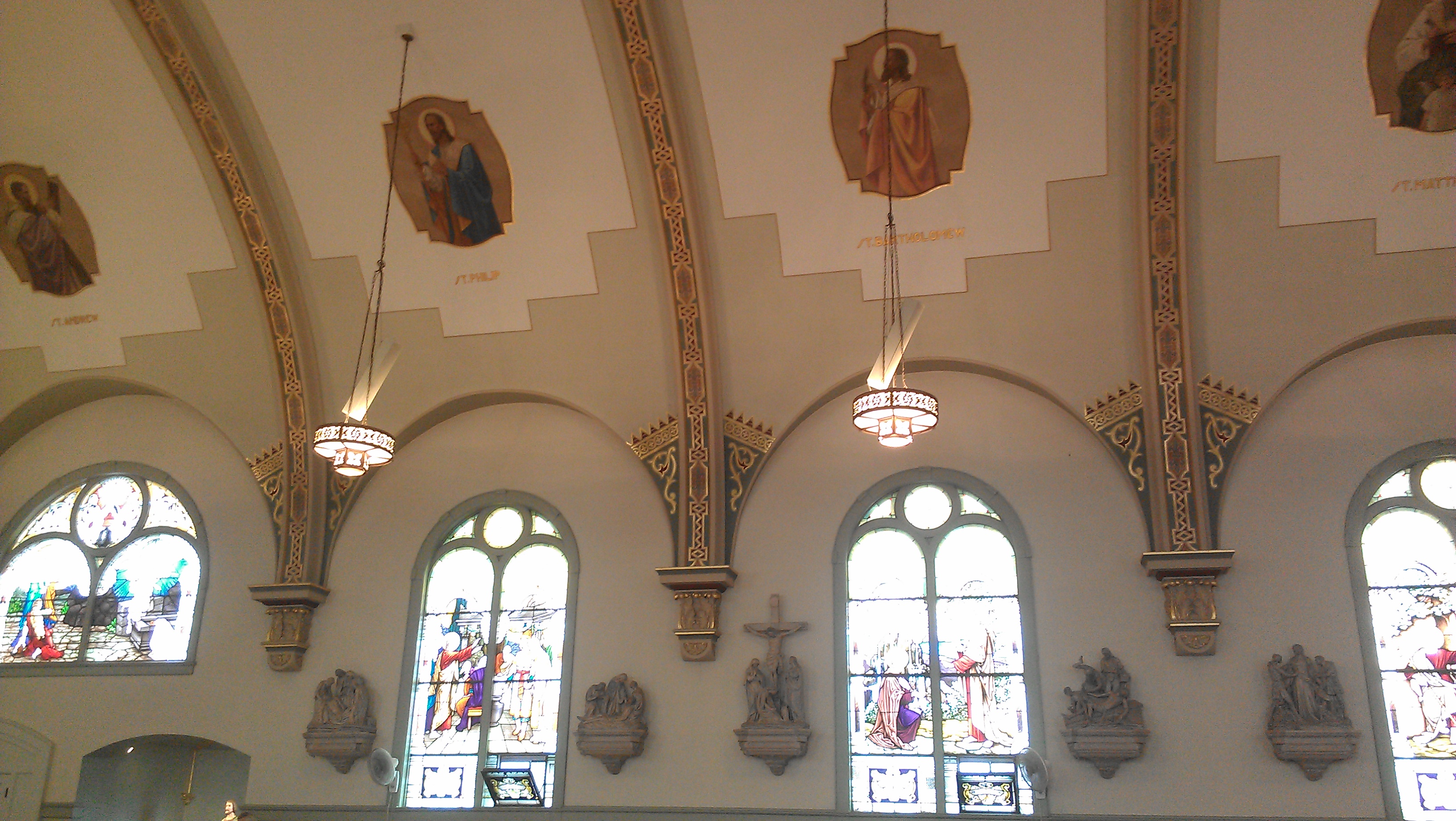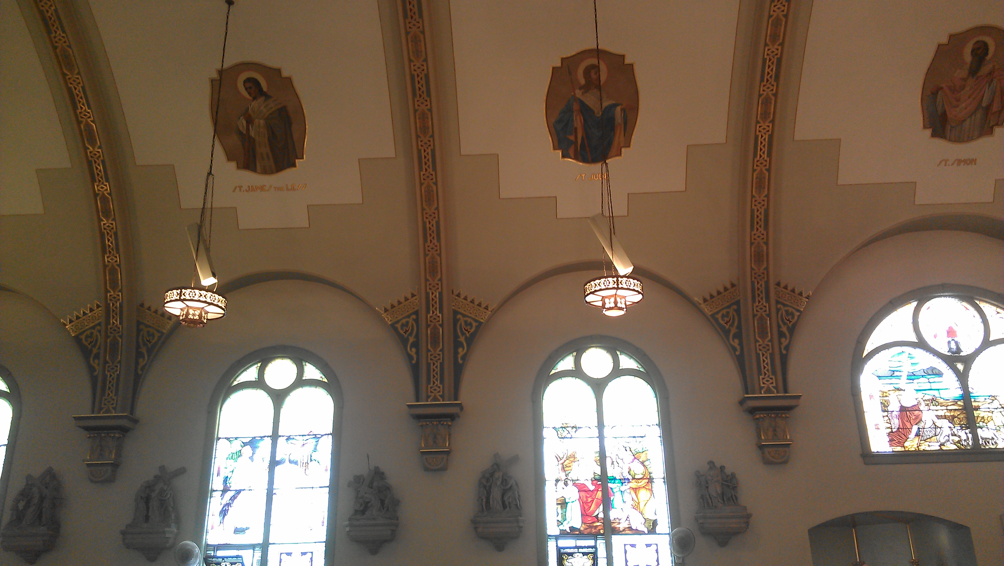 They have two very nice little chapels left (for Mary) and right (for St. Joseph) with votive lights, the stained glass is wonderful, and my favorite is the depiction of the 12 apostles over the naïve of the church. It’s a beautiful church!