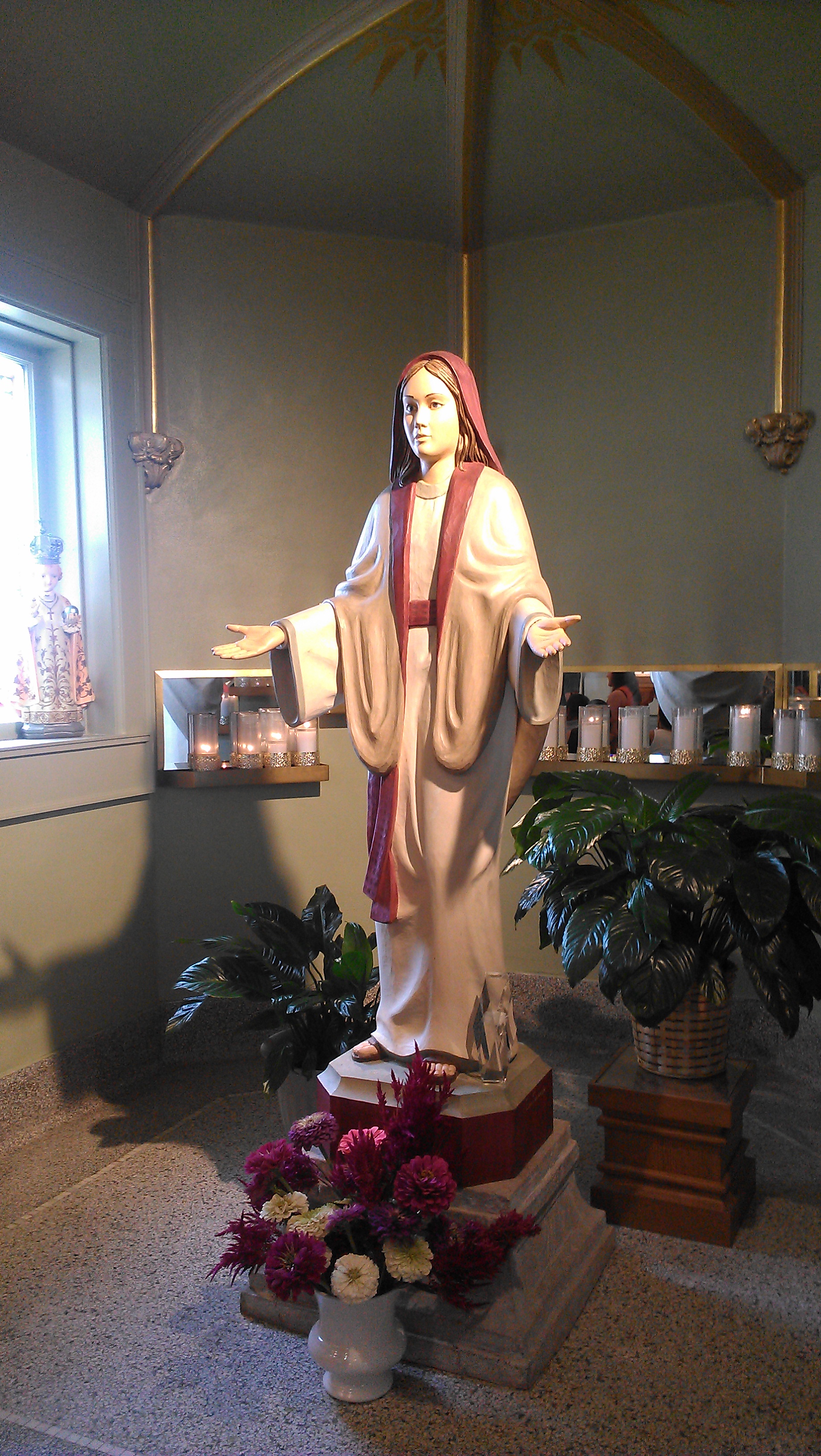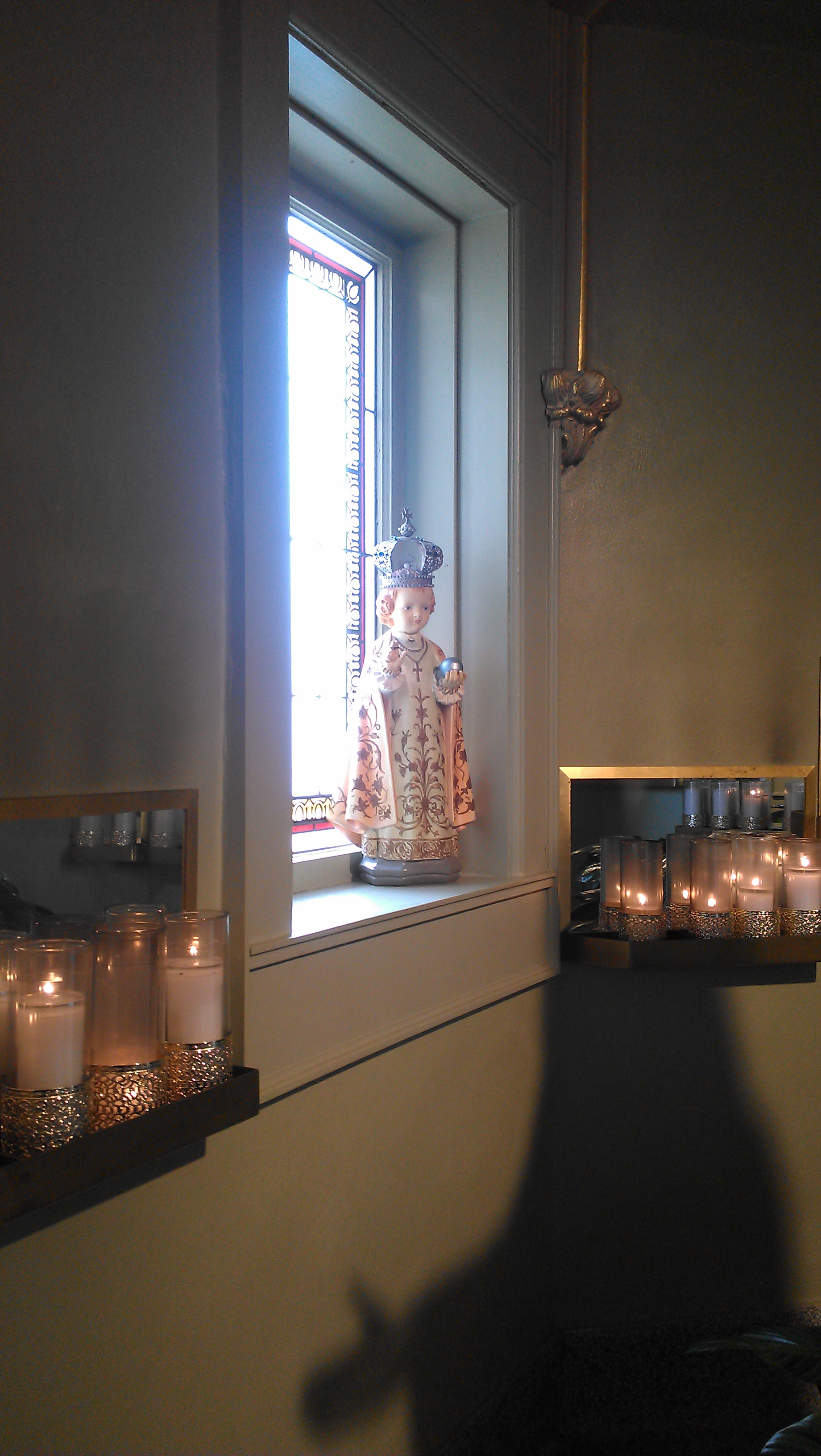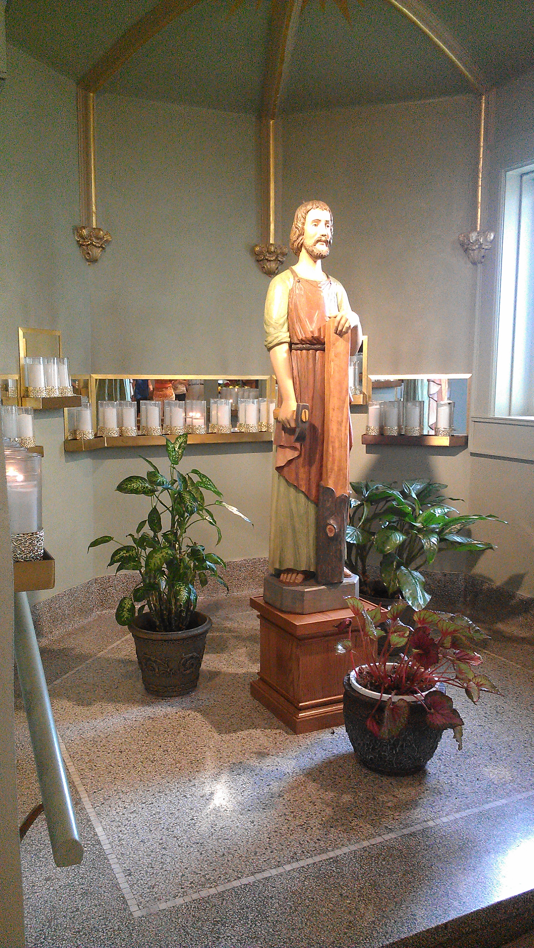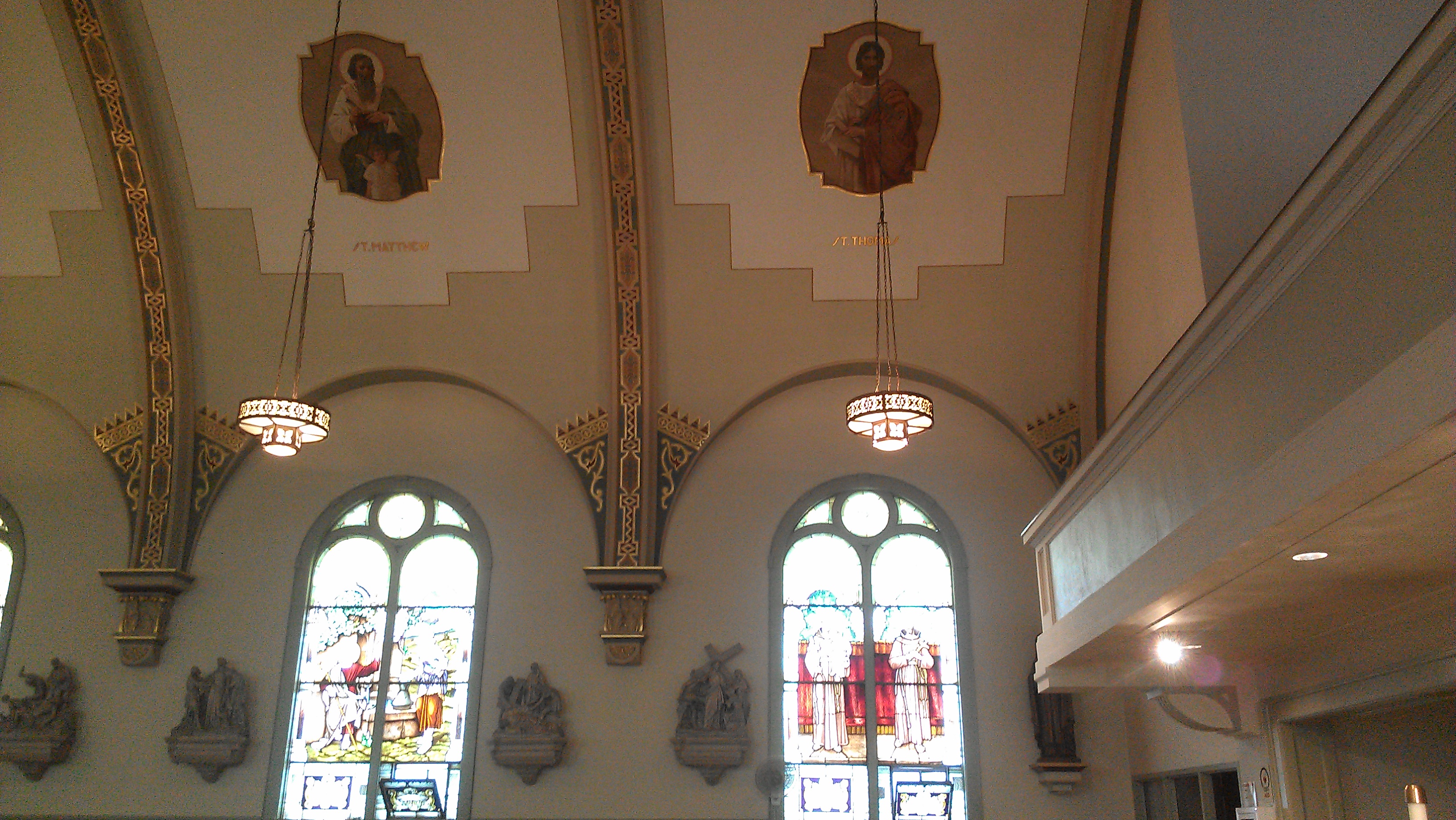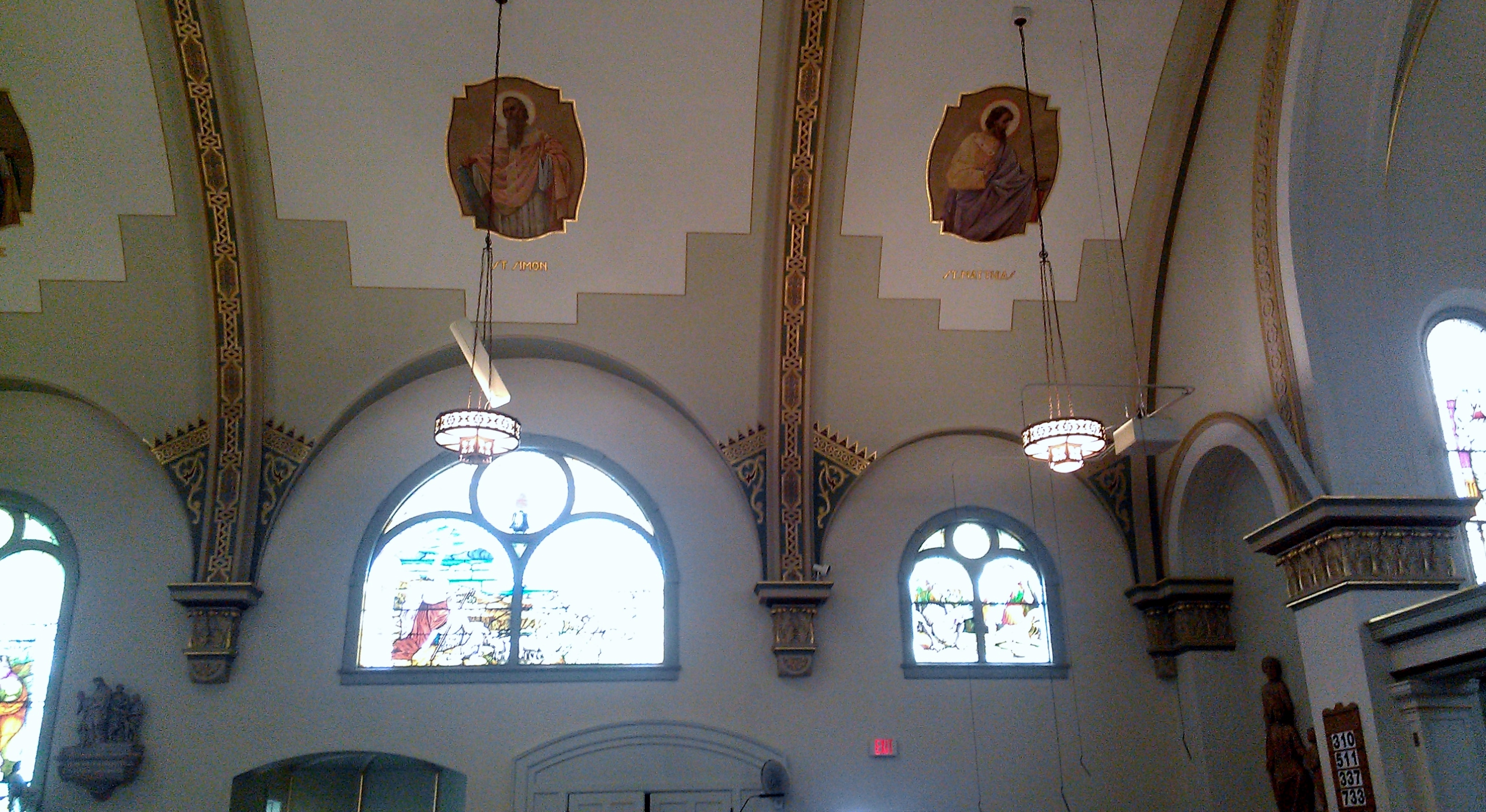 They have two very nice little chapels left (for Mary) and right (for St. Joseph) with votive lights, the stained glass is wonderful, and my favorite is the depiction of the 12 apostles over the naïve of the church. It’s a beautiful church!