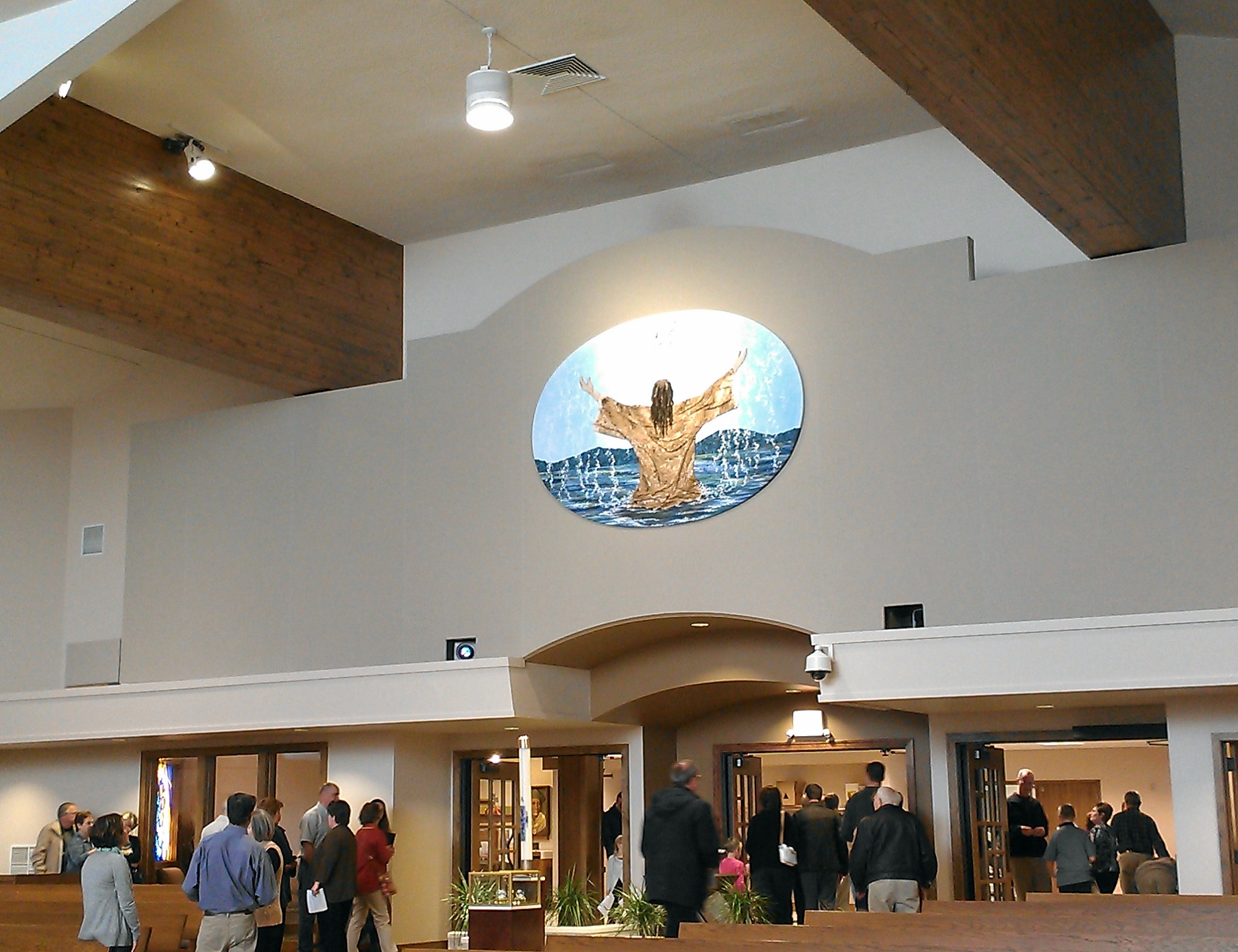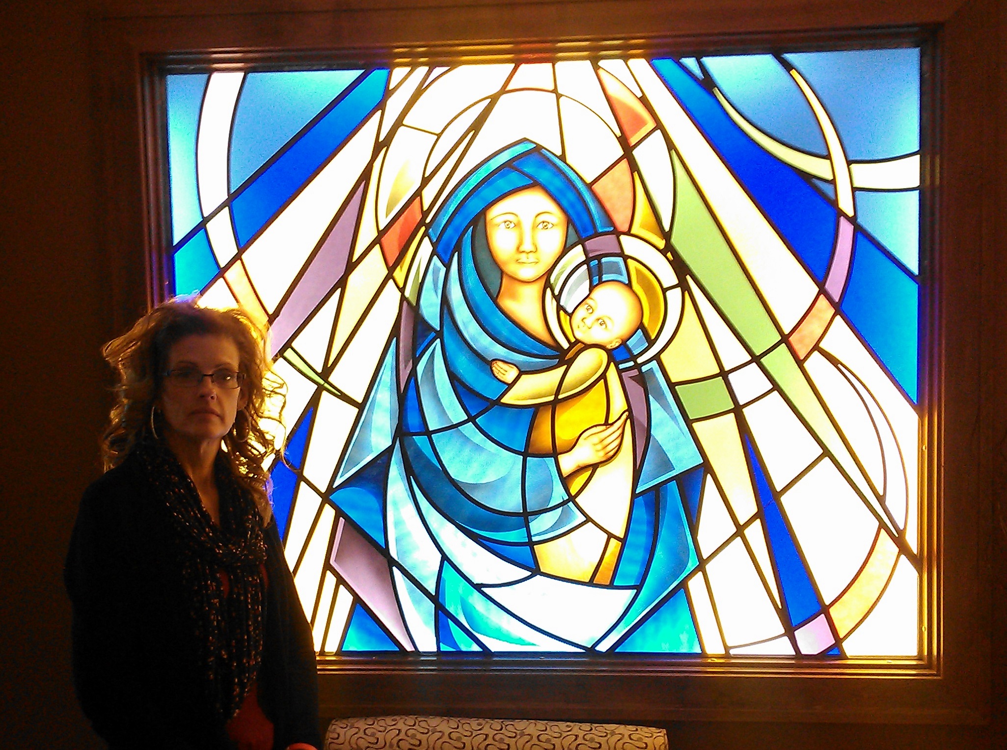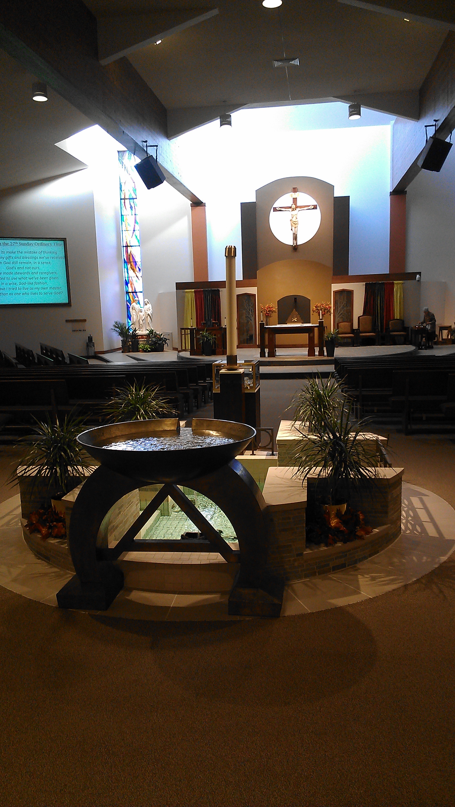 Kay felt the church was more modern and “urban” in feel. Not unfriendly, but you could tell you were in the city. She loved the fountain going into church and the stained glass picture of Mary in the parent/child area.