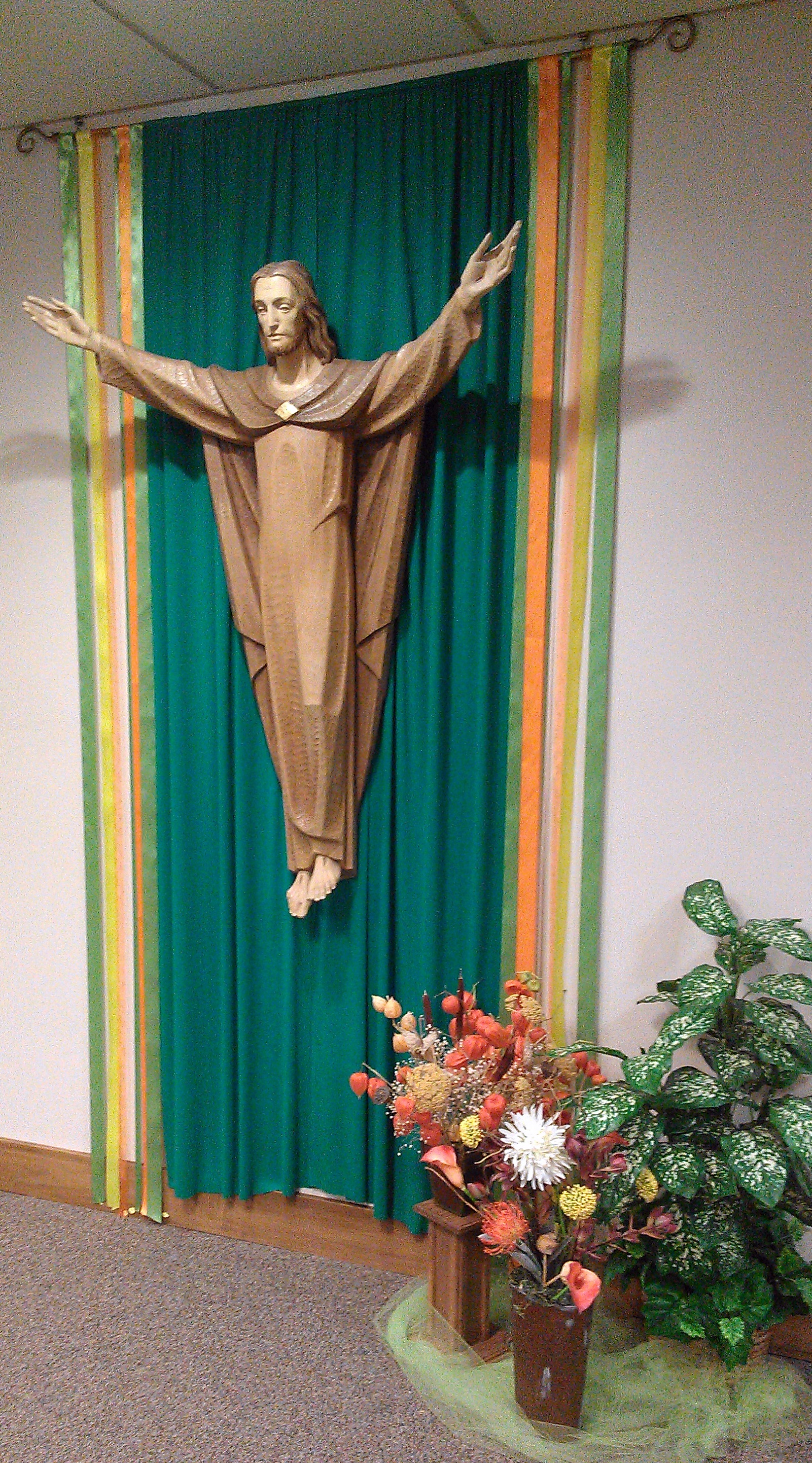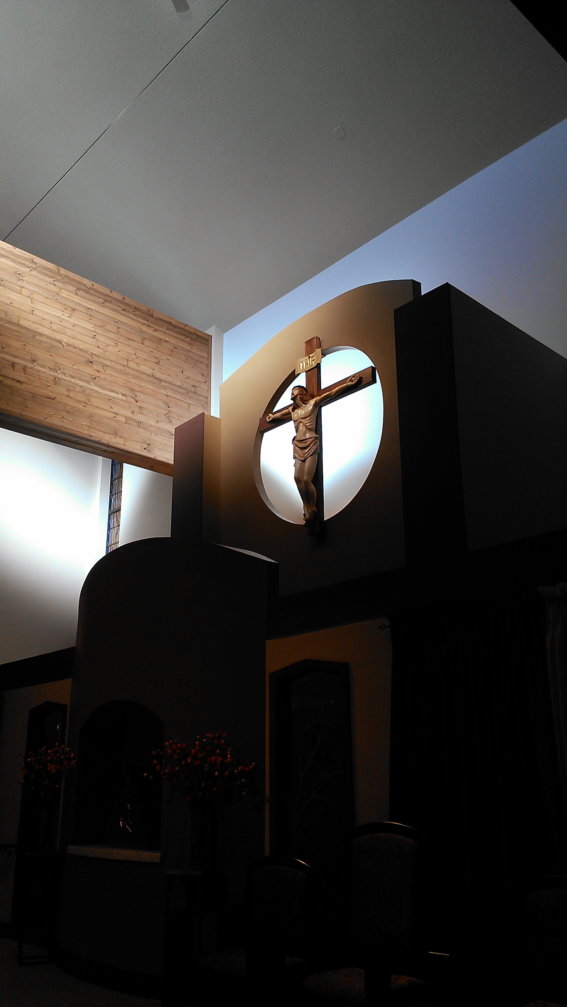 The church itself is the more modern “surround” layout with the Altar in the center and the pews fanning out in a semi-circle from it. The tabernacle is behind the Altar and there is a spectacular Crucifix overhead. The sanctuary is awesome.