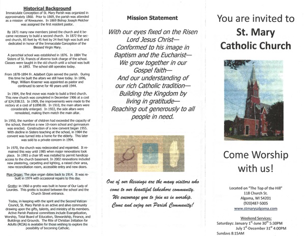 Currently St. Mary of Algoma is linked with Holy Rosary parish in Kewaunee and is administered by Deacon Chuck Agnew, but the parish has a long history. Per the brochure we were given by one on the very friendly parishioners, the parish began in 1860 and was assigned their first priest in 1869. The current church was built in 1904. For more details see the brochure below.