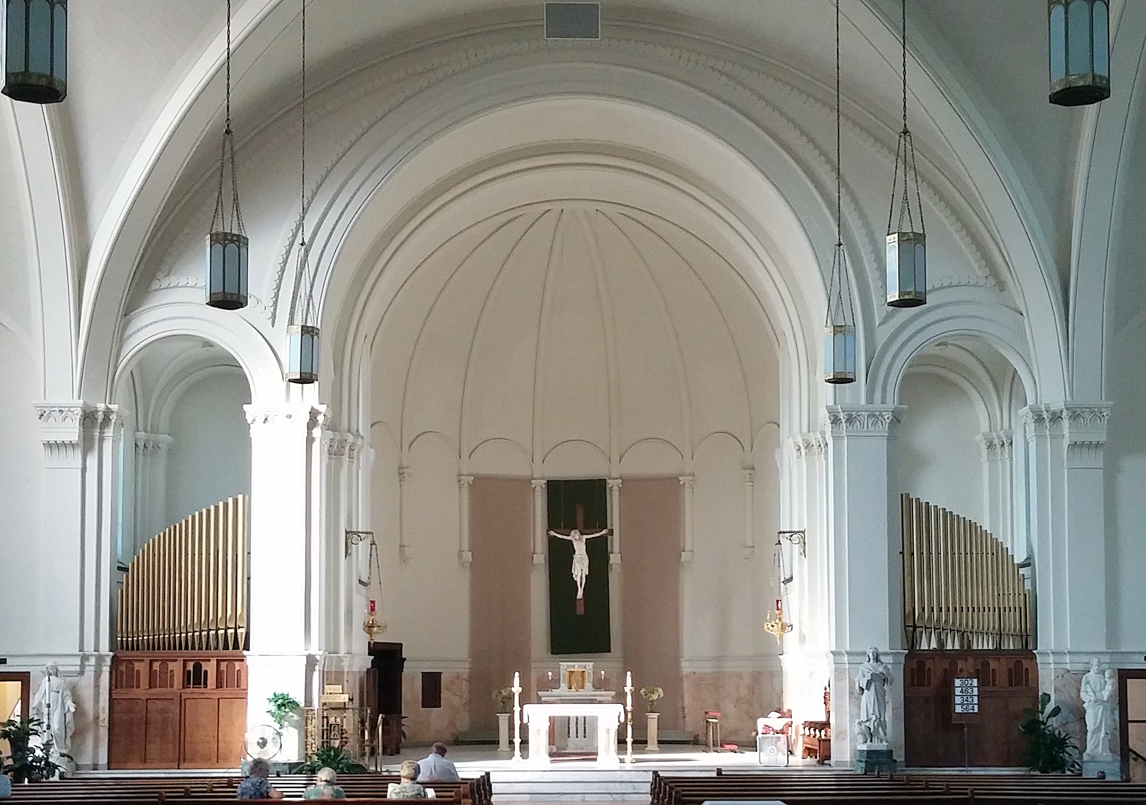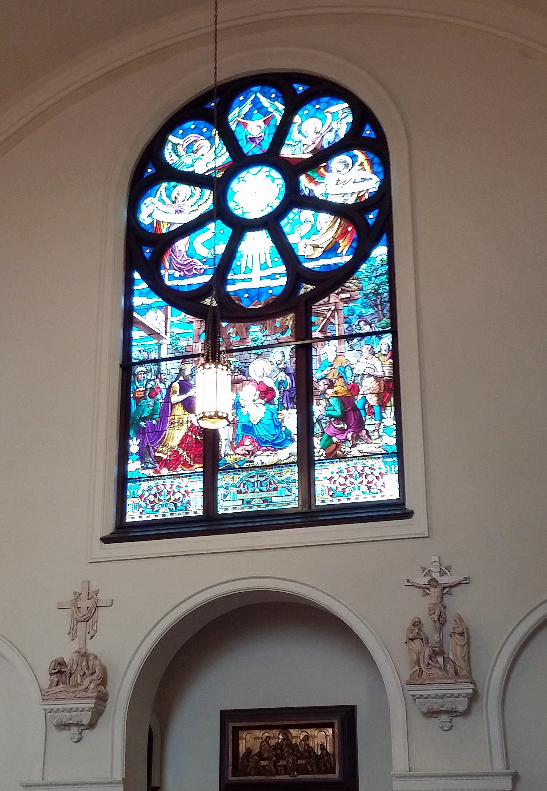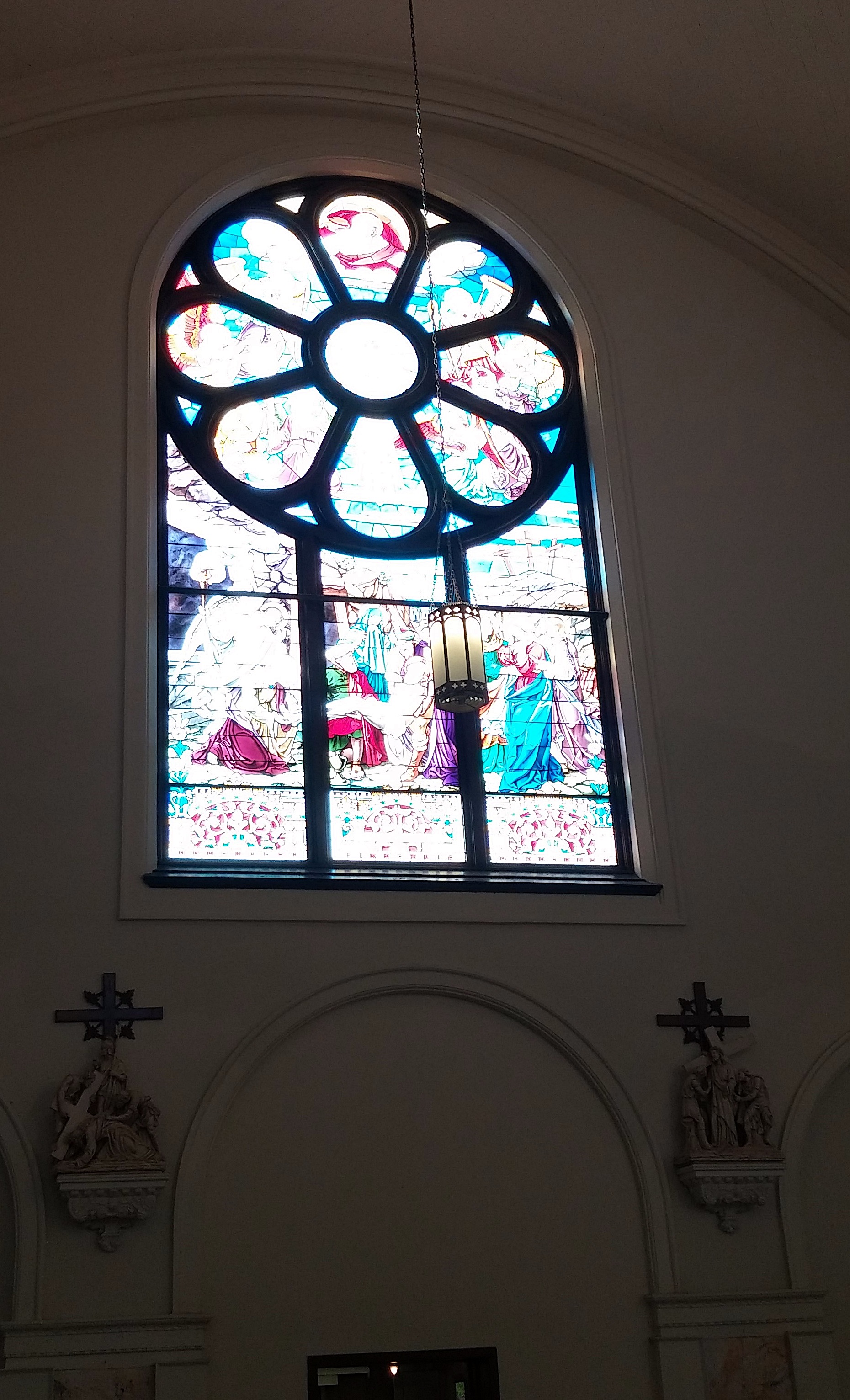 On March 13, 1911, a third disastrous fire occurred at St. John’s, faulty wiring the cause. The new church caught fire, gutting the building. The parishioners again built a new church, on the opposite side of the rectory, completing the French Romanesque style structure in 1915. Rev. Leo Ricklin, then pastor of St. John's Congregation, supervised the construction of the present church located on the corner of St John and South Madison Streets, which was the former site of for the C. A. Lawton House, The Convent of the Sisters of Our Lady of Charity, and the first St. Jospeph's Academy. This church was designed by architect Henry Foeller with Jospeh Foeller as the gerneral contractor and Fabry Construction Company in charge of the masonry work. Artist Charles Lorin of Chartres, France, created the stained-glass windows. During the first half of the 20th century St. John's grew to be the largest congregation in the city, but by the 1970's and 1980's it became the smallest congregation in the city.