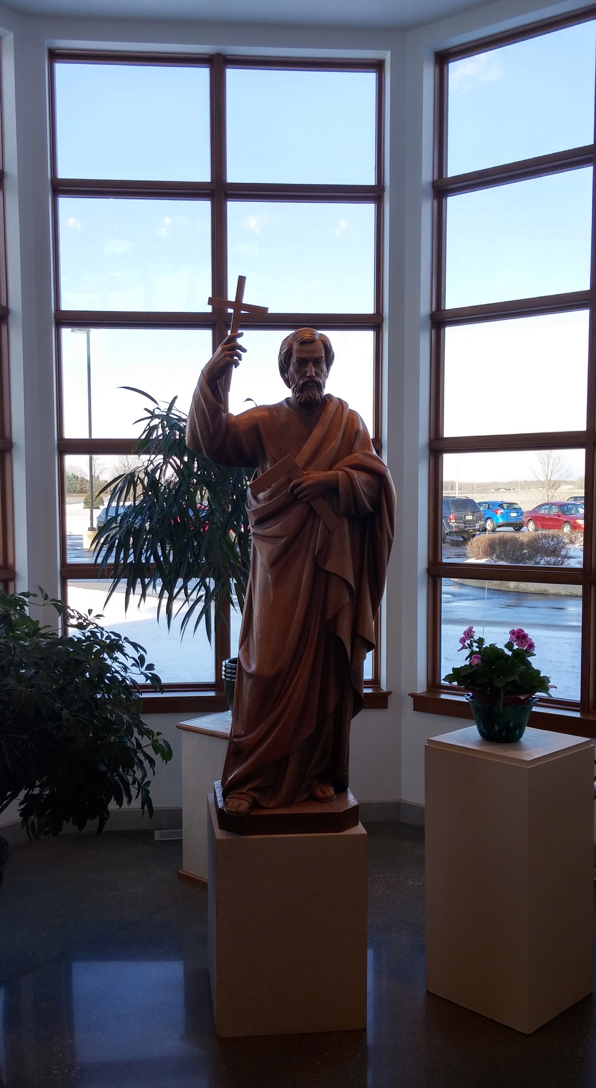 The Compass article is linked below and is where I got most of this info, and I found that “St. Thomas the Apostle, which formed in 2000 with the merger of four area parishes in rural Manitowoc County. The former parishes of St. Isidore (Osman), St. Joseph (Alverno), St. Casimir (Northeim) and St. Wendel (Cleveland) merged in July 2000.” Funny as I only recognize the town of Cleveland. The new building was built and completed in 2014 when they “moved” in.