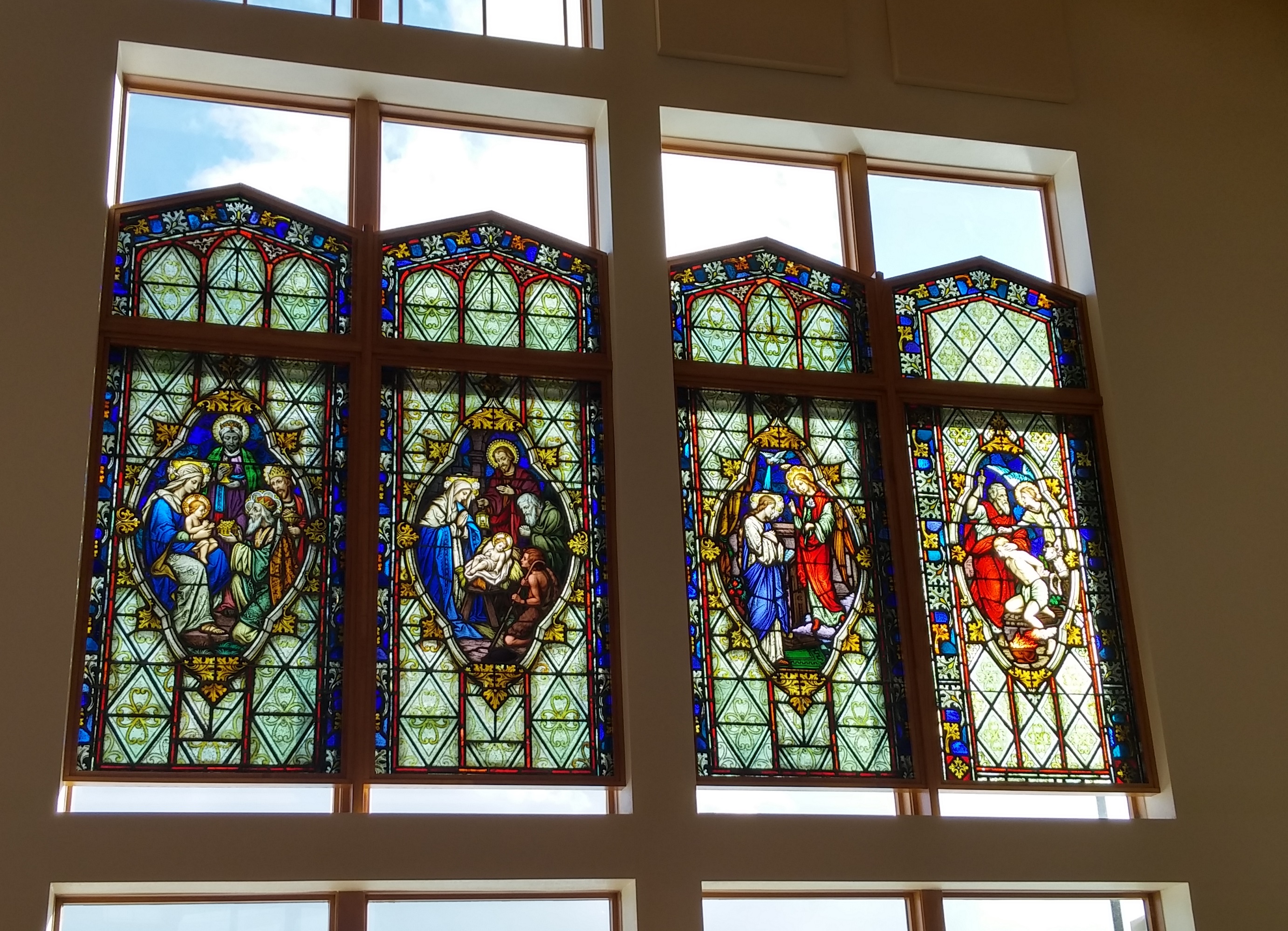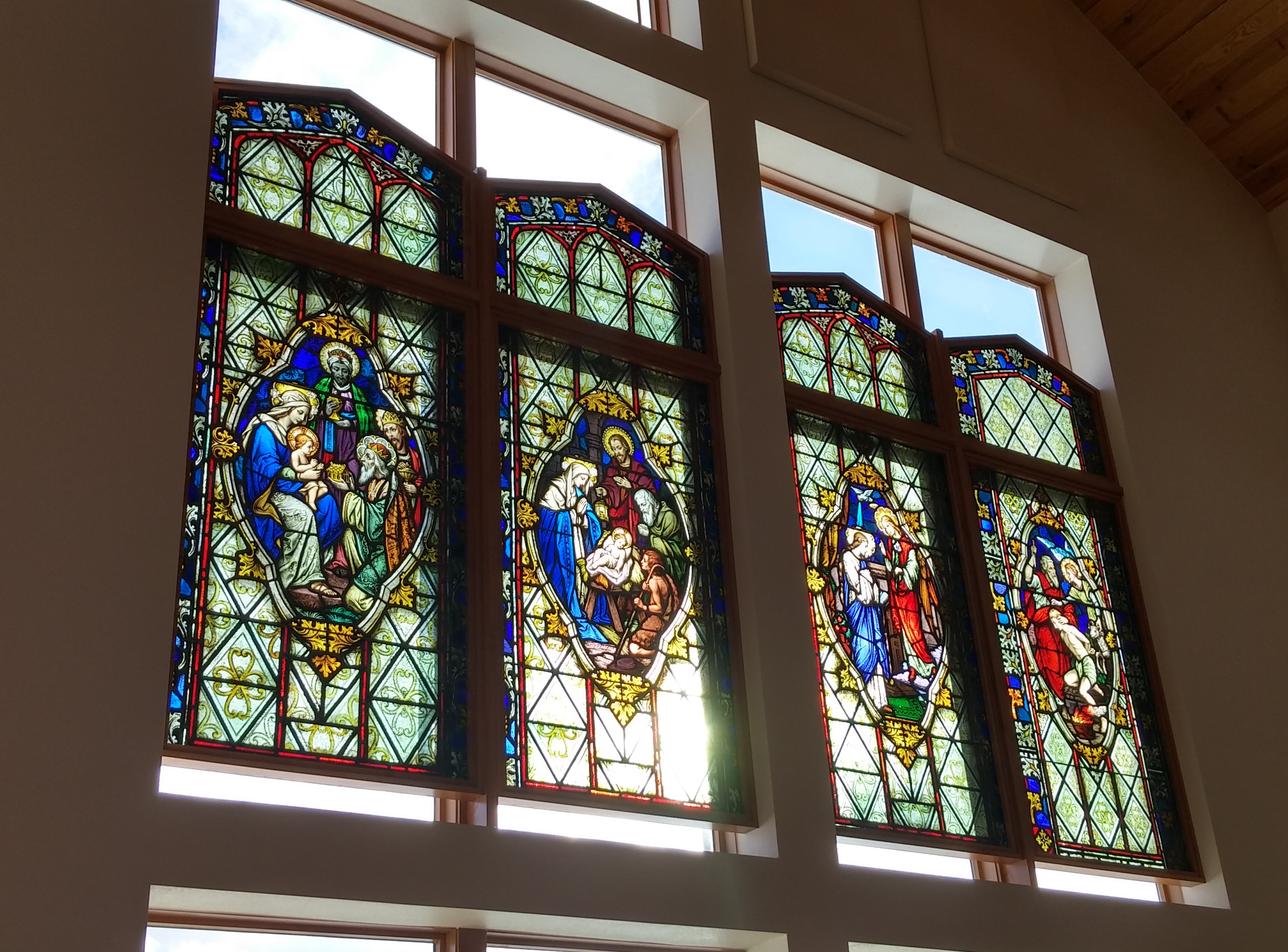 As is often the case, parts of each of the old parishes are incorporated into the new church building, and we note that “Artifacts from all four previous parishes were incorporated into the church, which was built by Hamann Construction of Manitowoc.” Also “Other subtle, yet symbolically significant, elements inside the new church are the four stone pillars, which represent the four previous parishes serving as the foundation for the current parish.” Finally we read “…that statues of Mary and Joseph as well as the cross on top of the church came from St. Wendel, some of the vessels came from St. Casimir, the baptistery came from St. Joseph, and the stained glass windows and tabernacle came from St. Isidore.”