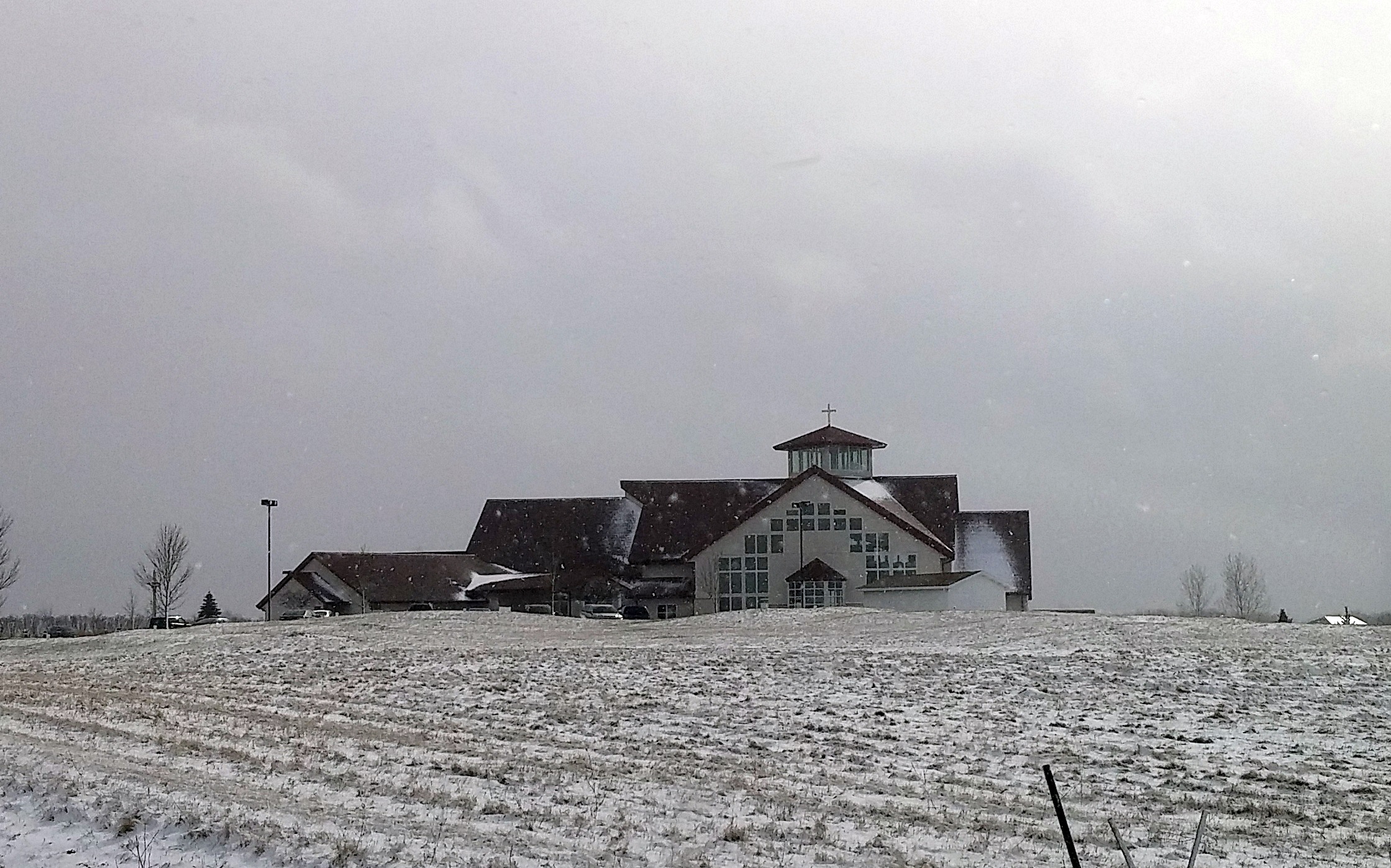 During Mass I think we had sun to start, snow during the readings, sun during the homily, more snow during communion, and again sun to end Mass. On the way to St. Nazianz, we hit a particularly heavy cell that actually had snow sticking to the ground, but by the time we hit town, it was clear and sunny again. Weird but beautiful weather for sure!