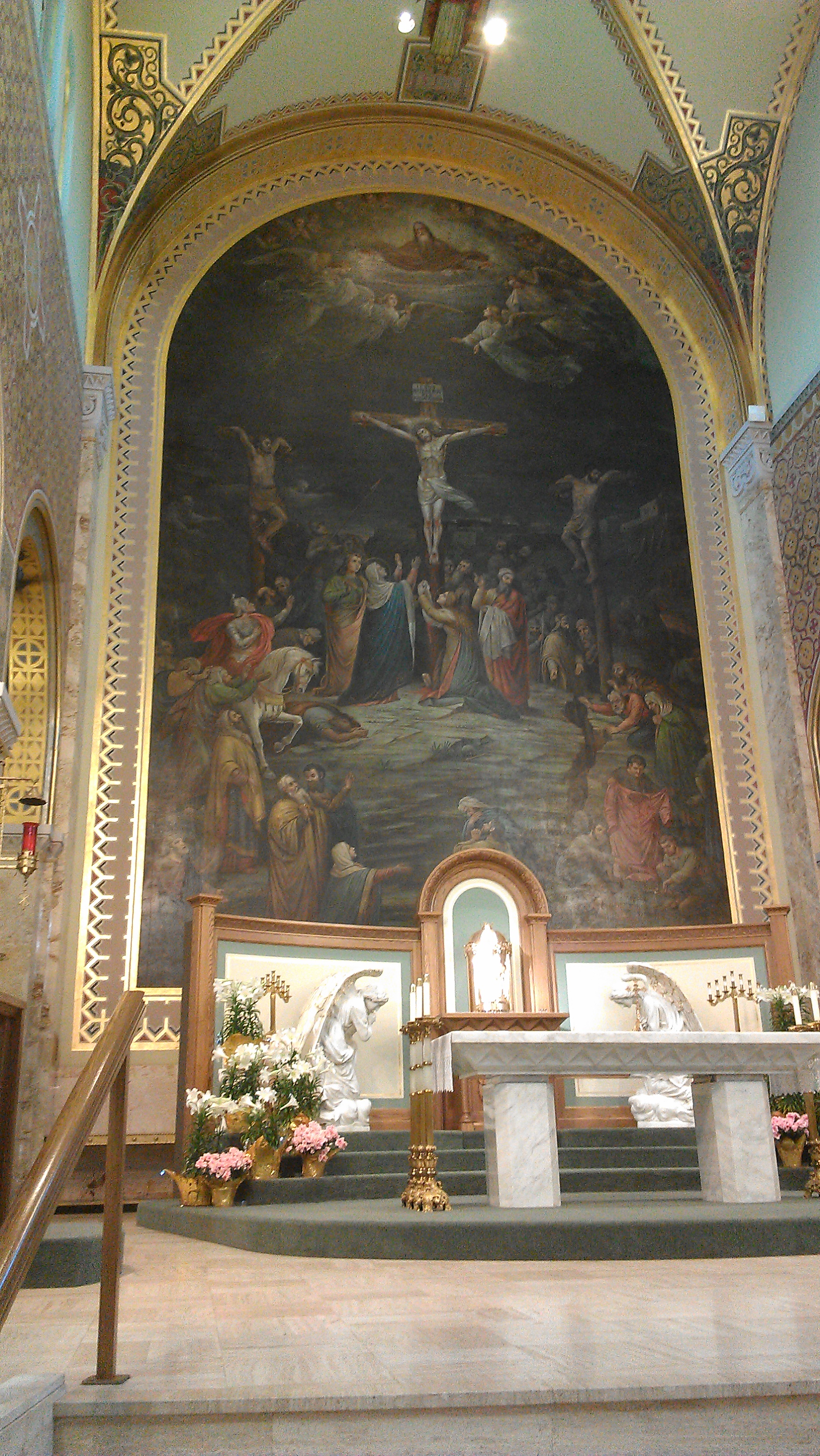 Bishop Krautbauer is interred under a granite slab in the floor at the Bishop Wycislo entrance. A 40 by 25 foot mural entitled "The Crucifixion" is painted on the rear wall of the sanctuary. It was painted in 1883 by Johann Schmitt, a German Immigrant. Eight paintings by Josef Albrecht were installed in the Cathedral in the early 1900's representing the eight beatitudes. The figures of the four evangelists are painted on the ceiling of the sanctuary. A double circle joins them with the phrase "The Word of the Lord Endreth Forever" inscribed within the ring. The four evangelists and their symbols are also carved on the front of the wooden abo to the right.
